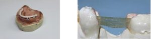 MATERIALI PER ARMATURE PROTESICHE PROVVISORIERiguardo i materiali per armature va al primo posto il PEEK (versatile biomateriale polimerico) che presenta modulo di elasticità come la corticale ossea, straordinaria resistenza e flessibilità, ottima adesione con i compositi, contrazione minima. La sua proprietà mimetica lo fa preferire ai metalli tradizionali. fig. 22-23 Esso può essere rinforzato con le fibre di carbonio. fig.24