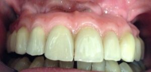 Questa terapia implanto protesica obsoleta si conclude con successo dopo circa un anno e due mesi con l’utilizzo di tre tipi di chirurgie in tempi diversi ( 1-estrazioni denti, 2-inserimento impianti, 3-riapertura delle gengive per esposizione impianti) e tre tipi di protesizzazioni (prima protesi mobile, dopo protesi fissa provvisoria e alla fine protesi fissa definitiva). Terapia lunga e sofferta…